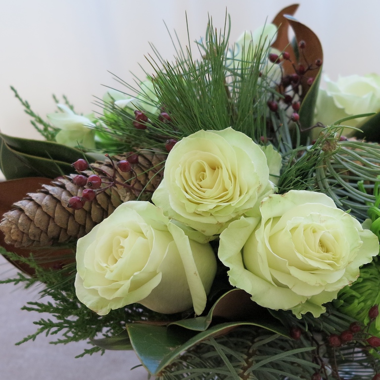 Small winter bouquet of white roses & orchids, green chrysanthemums. Festive gift just a click, tap or call away. Recommended as Christmas arrangement. Flower delivery in Toronto and GTA. Enjoy mobile and online shopping at local Toronto florist. If you need any assistance please call us at local flower shop. We offer downtown Toronto flower delivery.