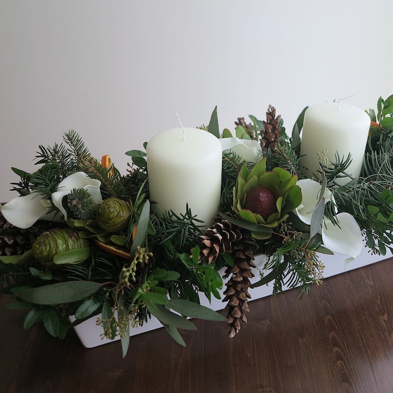 Elegant Christmas arrangement of white calla lilies in white designer container. Posh Christmas gift just a click, tap or call away. Recommended as: Christmas bouquet, Thank you floral gift or Holiday flowers. Enjoy mobile & online shopping at the best Toronto Christmas florist. If you need assistance please call our flower shop. We offer GTA & downtown Toronto flower delivery.