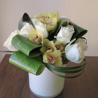 Bouquet of yellow orchids & white roses in a designer vase. Modern floral gift just a click, tap or call away. Recommended as: Anniversary bouquet, New baby floral gift or Love you flowers. Enjoy mobile & online shopping at top Toronto florist. If you need assistance please call our flower shop. We offer GTA & downtown Toronto flower delivery.